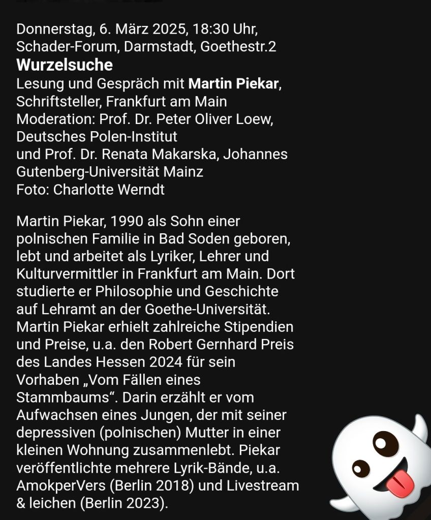Meine Lesung in Darmstadt beim deutschen-Polen Institut. Es wird Prosa und Poesie geben. Es gibt das Sprechen als hin und her – Zwischen Menschen, Bedeutungen und Texten.