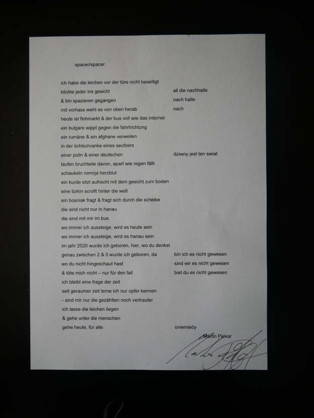 Ich war erschüttert, als letztes Jahr der Anschlag in Hanau geschah. Ich war den ganzen Tag wortlos spazieren und konnte es nur mit einem Gedicht überwinden. Das Gedicht begleitet mich nun seit einem Jahr und ich habe einen kleinen Clip dazu gemacht: spacer/spacer heißt das Gedicht, man kann sich den Clip samt Gedicht auf YouTube anschauen. Es lässt mich nicht mehr los.
